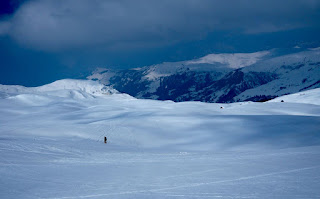 Higher and higher we went, and tiny skiers could be seen shooting off in all directions for summits and cols..... the final pull up to our col after 4 hours was tricky on dry loose snow.